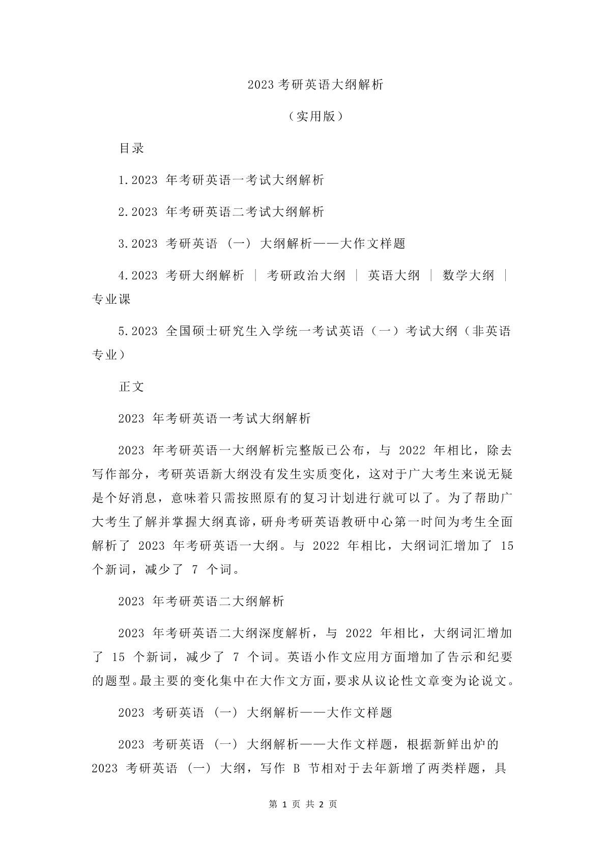 2023考研英语大纲解析(实用版)目录1.2023年考研英语一考试大纲解析2.2023年考研英语二考试大纲解析3.2023考研英语(一)大纲解析——大作文样题4.2023考研大纲解析|考研政治大纲|英语大纲|数学大纲|专业课5.2023全国硕士研究生入学统一考试英语(一)考试大纲(非英语专业)正文2023年考研英语一考试大纲解析2023年考研英语一大纲解析完整版已公布,与2022年相比,除去写作部分,考研英语新大纲没有发生实质变化,这对于广大考生来说无疑是个好消息,意味着只需按照原有的复习计划进行就可以了