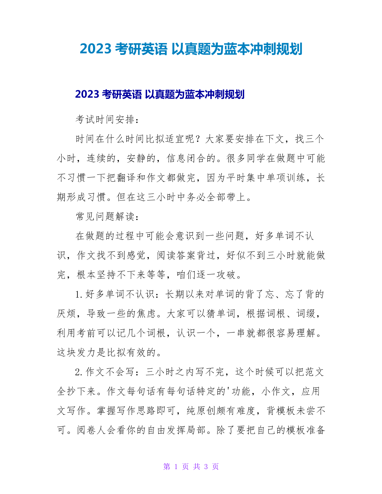 2023考研英语以真题为蓝本冲刺规划2023考研英语以真题为蓝本冲刺规划考试时间安排:时间在什么时间比拟适宜呢?大家要安排在下文,找三个小时,连续的,安静的,信息闭合的。很多同学在做题中可能不习惯一下把翻译和作文都做完,因为平时集中单项训练,长期形成习惯。但在这三小时中务必全部带上。常见问题解读:在做题的过程中可能会意识到一些问题,好多单词不认识,作文找不到感觉,阅读答案背过,好似不到三小时就能做完,根本坚持不下来等等,咱们逐一攻破。1.好多单词不认识:长期以来对单词的背了忘、忘了背的厌烦,导致一些的焦虑