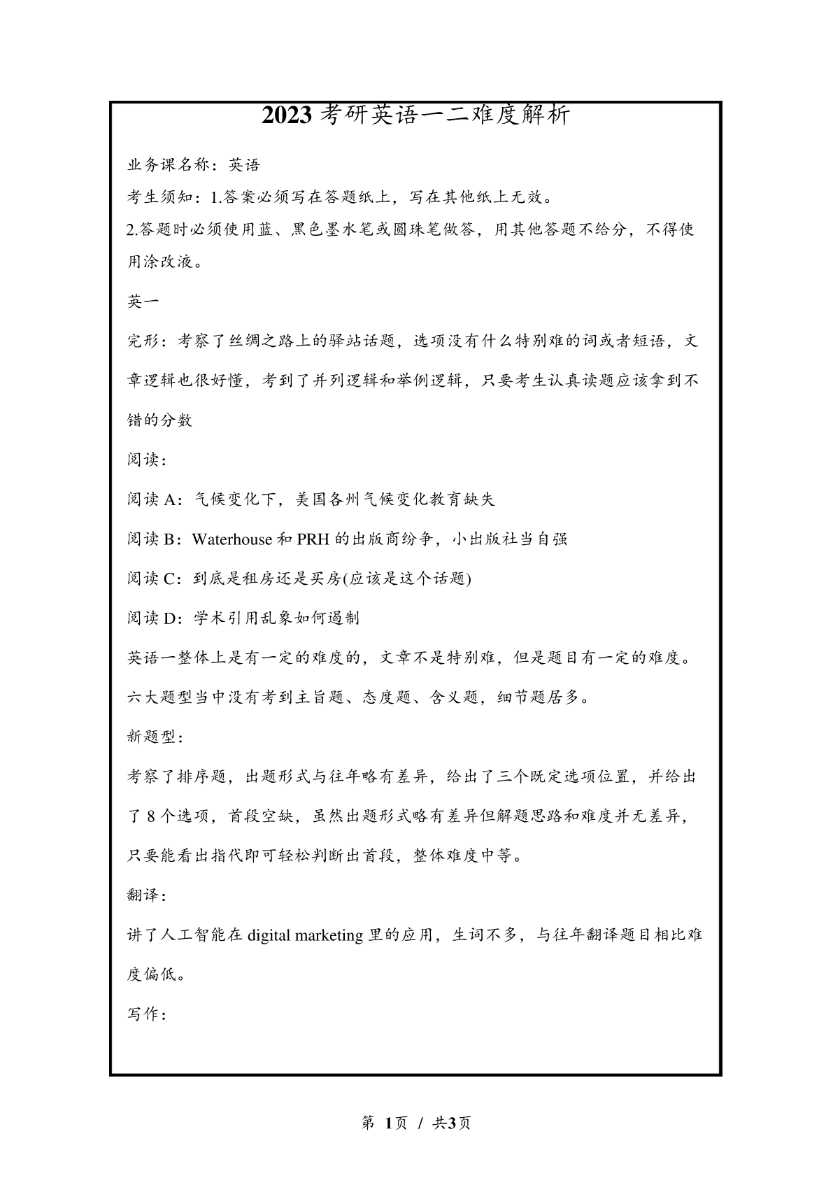 2023考研英语一二难度解析业务课名称:英语考生须知:1.答案必须写在答题纸上,写在其他纸上无效。2.答题时必须使用蓝、黑色墨水笔或圆珠笔做答,用其他答题不给分,不得使用涂改液。英一完形:考察了丝绸之路上的驿站话题,选项没有什么特别难的词或者短语,文章逻辑也很好懂,考到了并列逻辑和举例逻辑,只要考生认真读题应该拿到不错的分数阅读:阅读A:气候变化下,美国各州气候变化教育缺失阅读B:Waterhouse和PRH的出版商纷争,小出版社当自强阅读C:到底是租房还是买房(应该是这个话题)阅读D:学术引用乱象如何遏