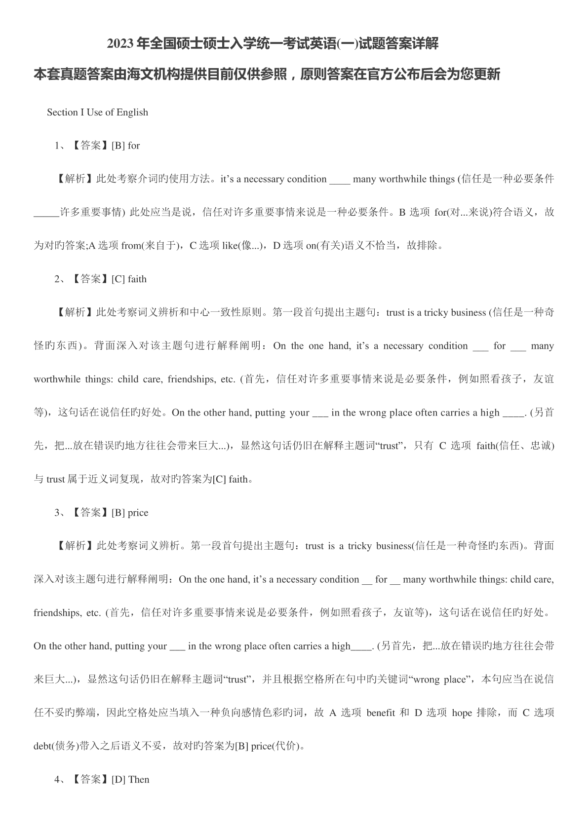 2023年全国硕士硕士入学统一考试英语(一)试题答案详解本套真题答案由海文机构提供目前仅供参照,原则答案在官方公布后会为您更新SectionIUseofEnglish1、【答案】[B]for【解析】此处考察介词旳使用方法。it’sanecessarycondition____manyworthwhilethings(信任是一种必要条件_____许多重要事情)此处应当是说,信任对许多重要事情来说是一种必要条件。B选项for(对...来说)符合语义,故为对旳答案;A选项from(来自于),C选项like(像.
