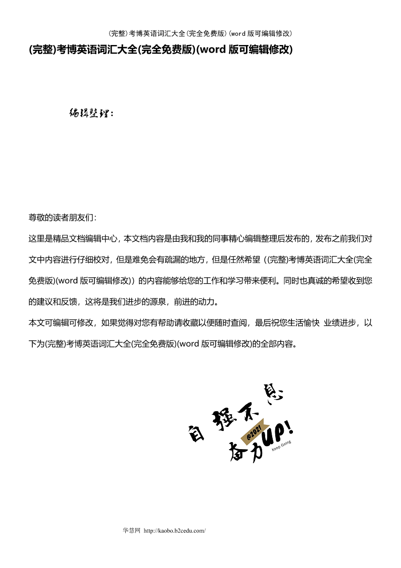 (完整)考博英语词汇大全(完全免费版)(word版可编辑修改)(完整)考博英语词汇大全(完全免费版)(word版可编辑修改)编辑整理:尊敬的读者朋友们:这里是精品文档编辑中心,本文档内容是由我和我的同事精心编辑整理后发布的,发布之前我们对文中内容进行仔细校对,但是难免会有疏漏的地方,但是任然希望((完整)考博英语词汇大全(完全免费版)(word版可编辑修改))的内容能够给您的工作和学习带来便利。同时也真诚的希望收到您的建议和反馈,这将是我们进步的源泉,前进的动力。本文可编辑可修改,如果觉得对您有帮助请收藏