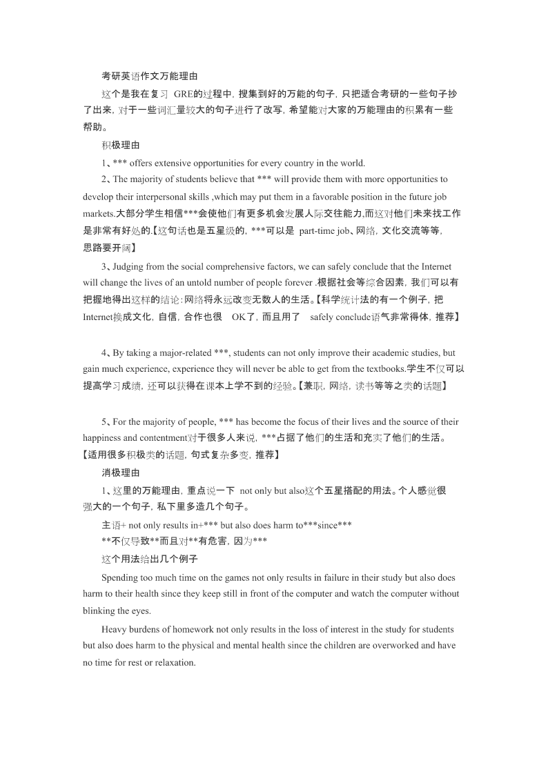 考研英语作文万能理由这个是我在复习GRE的过程中,搜集到好的万能的句子,只把适合考研的一些句子抄了出来,对于一些词汇量较大的句子进行了改写,希望能对大家的万能理由的积累有一些帮助。积极理由1、***offersextensiveopportunitiesforeverycountryintheworld.2、Themajorityofstudentsbelievethat***willprovidethemwithmoreopportunitiestodeveloptheirinterpersonalsk