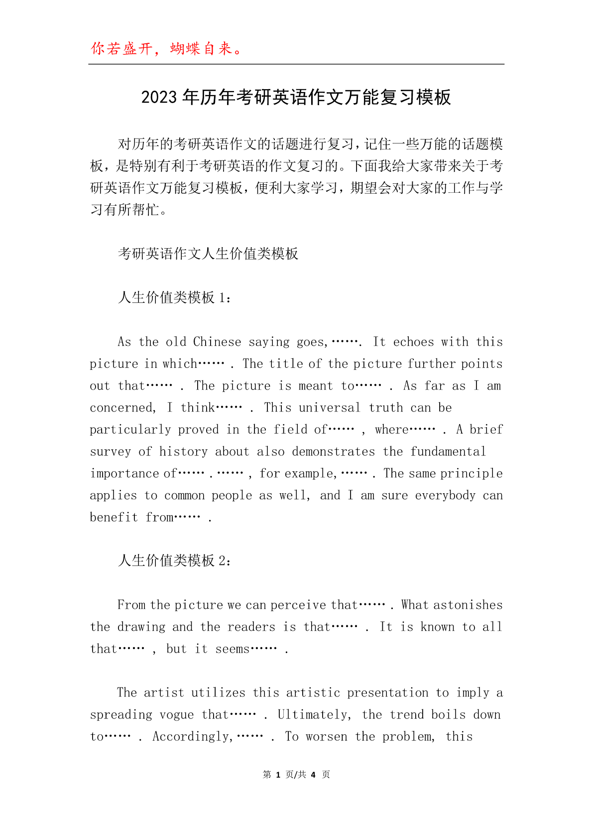 你若盛开,蝴蝶自来。2023年历年考研英语作文万能复习模板对历年的考研英语作文的话题进行复习,记住一些万能的话题模板,是特别有利于考研英语的作文复习的。下面我给大家带来关于考研英语作文万能复习模板,便利大家学习,期望会对大家的工作与学习有所帮忙。考研英语作文人生价值类模板人生价值类模板1:AstheoldChinesesayinggoes,…….Itechoeswiththispictureinwhich…….Thetitleofthepicturefurtherpointsoutthat…….Thepi