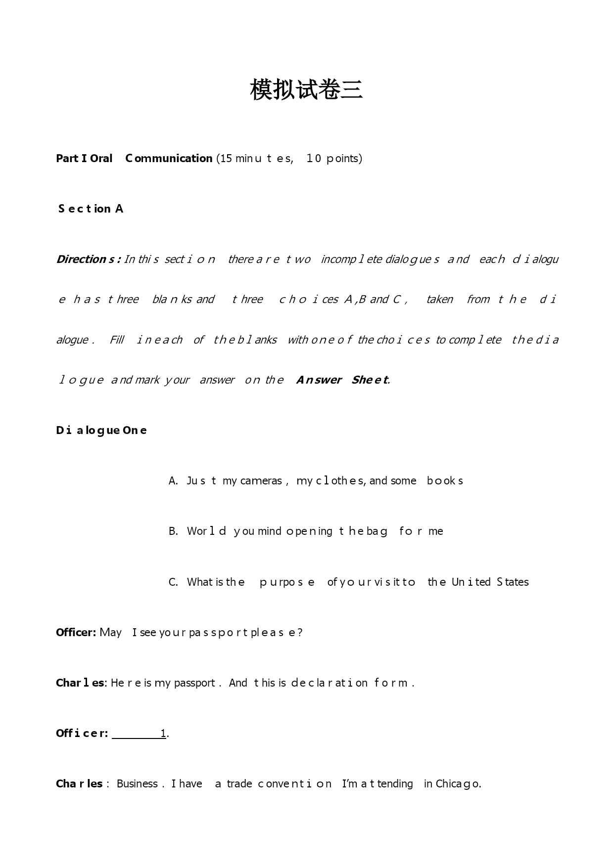模拟试卷三PartIOralCommunication(15minutes,10points)SectionADirections:InthissectiontherearetwoincompletedialoguesandeachdialoguehasthreeblanksandthreechoicesA,BandC,takenfromthedialogue.Fillineachoftheblankswithoneofthechoicestocompletethedialogueandmarkyoura