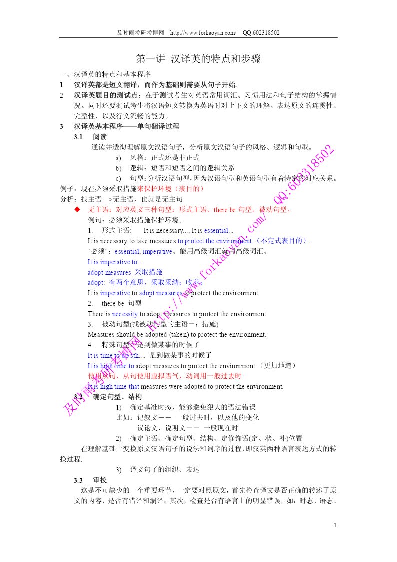 及时雨考研考博网http://www.forkaoyan.com/QQ:602318502第一讲汉译英的特点和步骤一、汉译英的特点和基本程序1汉译英都是短文翻译,而作为基础则需要从句子开始.2汉译英题目的测试点:在于测试考生对英语常用词汇、习惯用法和句子结构的掌握情况。同时还要测试考生将汉语短文转换为英语时对上下文的理解。表达原文的连贯性、完整性、以及行文流畅的能力。3汉译英基本程序——单句翻译过程3.1阅读通读并透彻理解原文汉语句子,分析原文汉语句子的风格、逻辑和句型。a)风格:正式还是非正式b)逻辑: