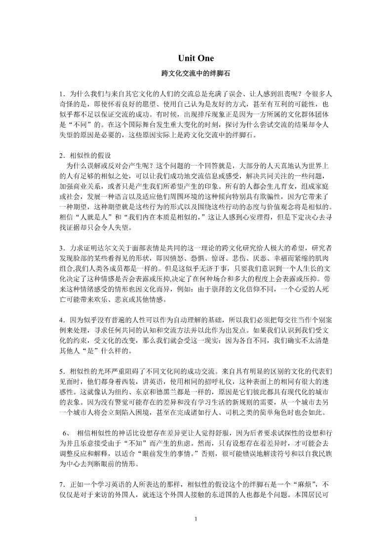 UnitOne跨文化交流中的绊脚石1.为什么我们与来自其它文化的人们的交流总是充满了误会、让人感到沮丧呢?令很多人奇怪的是,即使怀着良好的愿望、使用自己认为是友好的方式,甚至有互利的可能性,也似乎都不足以保证交流的成功。有时候,出现排斥现象正是因为一方所属的文化群体团体是“不同”的。在这个国际舞台发生重大变化的时刻,探讨为什么尝试交流的结果却令人失望的原因是必要的,这些原因实际上是跨文化交流中的绊脚石。2.相似性的假设为什么误解或反对会产生呢?这个问题的一个回答就是,大部分的人天真地认为世界上的人有足够的