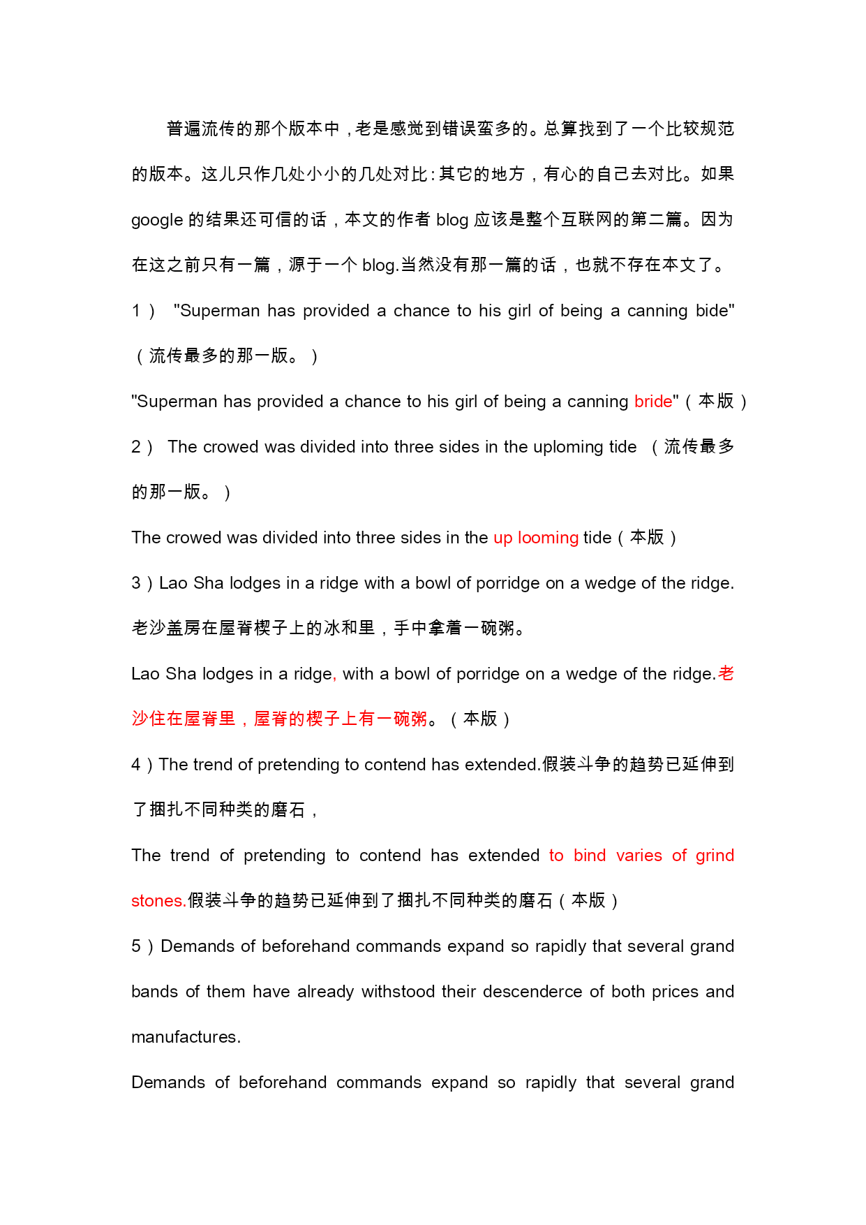 普遍流传的那个版本中,老是感觉到错误蛮多的。总算找到了一个比较规范的版本。这儿只作几处小小的几处对比:其它的地方,有心的自己去对比。如果google的结果还可信的话,本文的作者blog应该是整个互联网的第二篇。因为在这之前只有一篇,源于一个blog.当然没有那一篇的话,也就不存在本文了。1)"Supermanhasprovidedachancetohisgirlofbeingacanningbide"(流传最多的那一版。)"Supermanhasprovidedachancetohisgirlofbein
