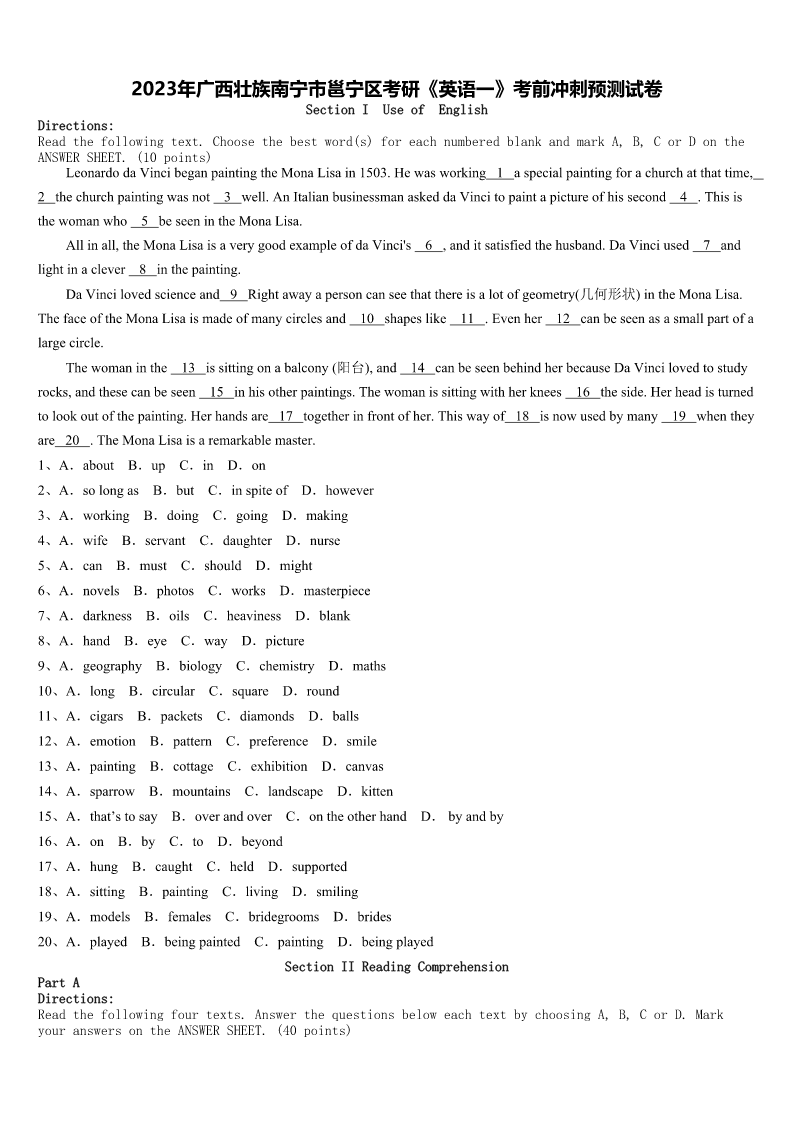 2023年广西壮族南宁市邕宁区考研《英语一》考前冲刺预测试卷SectionIUseofEnglishDirections:Readthefollowingtext.Choosethebestword(s)foreachnumberedblankandmarkA,B,CorDontheANSWERSHEET.(10points)LeonardodaVincibeganpaintingtheMonaLisain1503.Hewasworking1aspecialpaintingforachurchatthat
