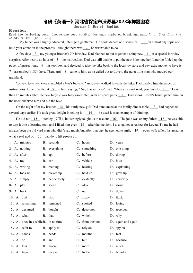 考研《英语一》河北省邢台市巨鹿县2023年深度预测试题SectionIUseofEnglishDirections:Readthefollowingtext.Choosethebestword(s)foreachnumberedblankandmarkA,B,CorDontheANSWERSHEET.(10points)Overtheyears,thankstomylife’sobstacles,Iunderstoodthemeaningoffaithandthestrongwilltosurvive.I