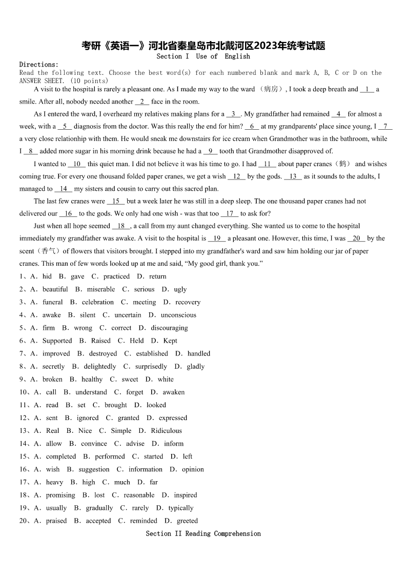 考研《英语一》河北省秦皇岛市北戴河区2023年统考试题SectionIUseofEnglishDirections:Readthefollowingtext.Choosethebestword(s)foreachnumberedblankandmarkA,B,CorDontheANSWERSHEET.(10points)Avisittothehospitalisrarelyapleasantone.AsImademywaytotheward(病房),Itookadeepbreathand1asmile.A