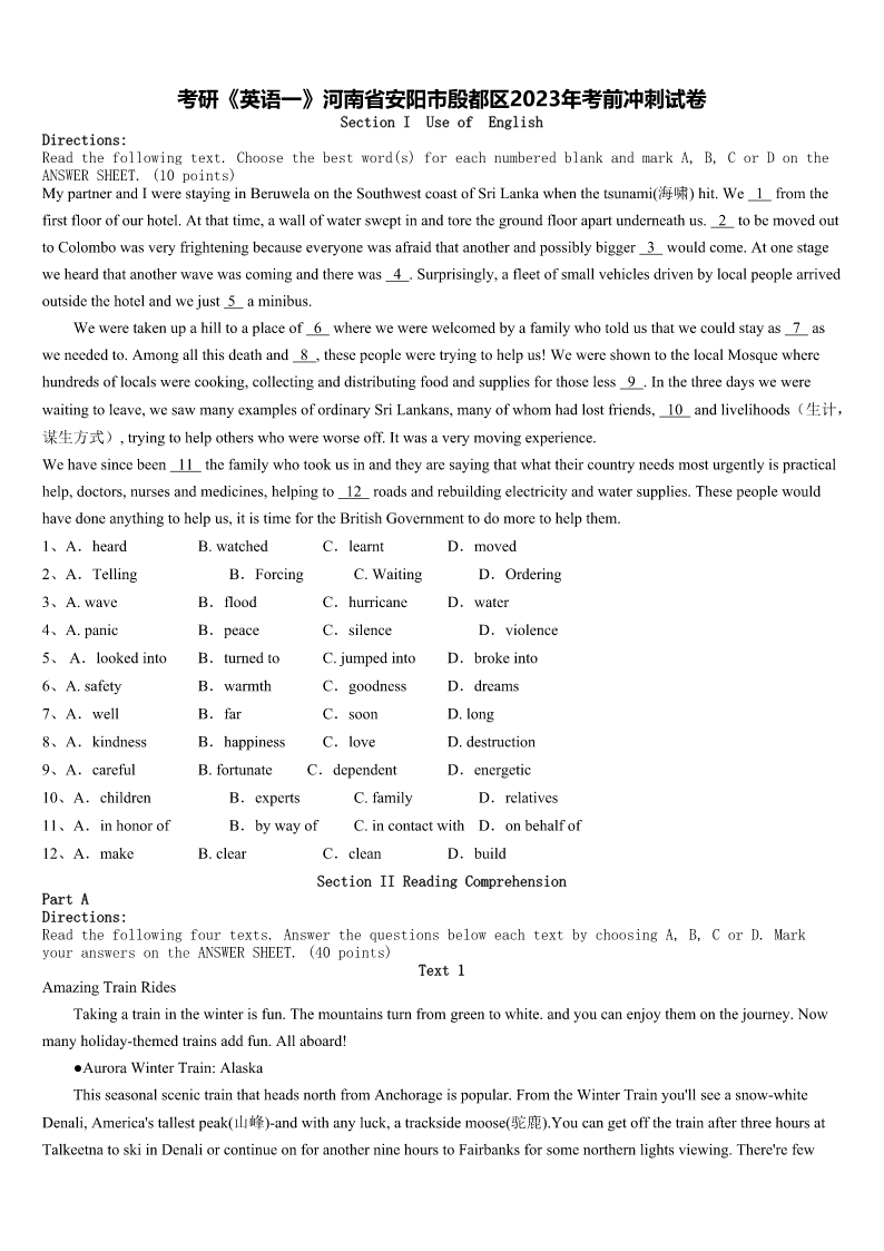 考研《英语一》河南省安阳市殷都区2023年考前冲刺试卷SectionIUseofEnglishDirections:Readthefollowingtext.Choosethebestword(s)foreachnumberedblankandmarkA,B,CorDontheANSWERSHEET.(10points)MypartnerandIwerestayinginBeruwelaontheSouthwestcoastofSriLankawhenthetsunami(海啸)hit.We1fromth