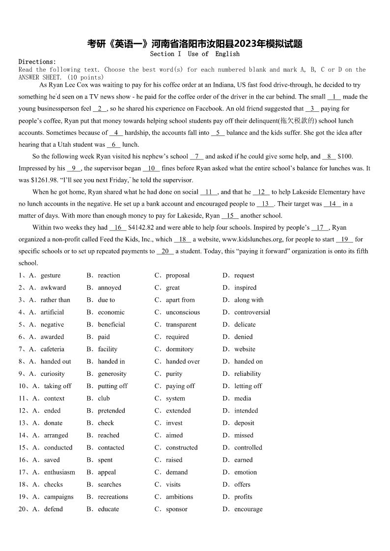 考研《英语一》河南省洛阳市汝阳县2023年模拟试题SectionIUseofEnglishDirections:Readthefollowingtext.Choosethebestword(s)foreachnumberedblankandmarkA,B,CorDontheANSWERSHEET.(10points)AsRyanLeeCoxwaswaitingtopayforhiscoffeeorderatanIndiana,USfastfooddrive-through,hedecidedtotryso