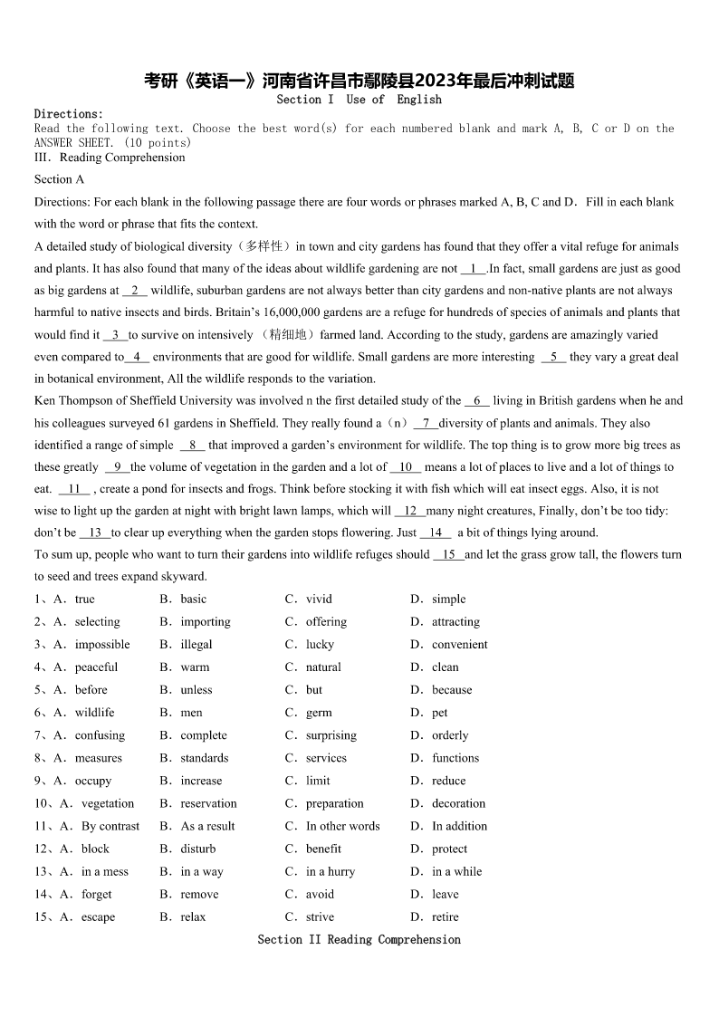 考研《英语一》河南省许昌市鄢陵县2023年最后冲刺试题SectionIUseofEnglishDirections:Readthefollowingtext.Choosethebestword(s)foreachnumberedblankandmarkA,B,CorDontheANSWERSHEET.(10points)III.ReadingComprehensionSectionADirections:Foreachblankinthefollowingpassagetherearefourwordso
