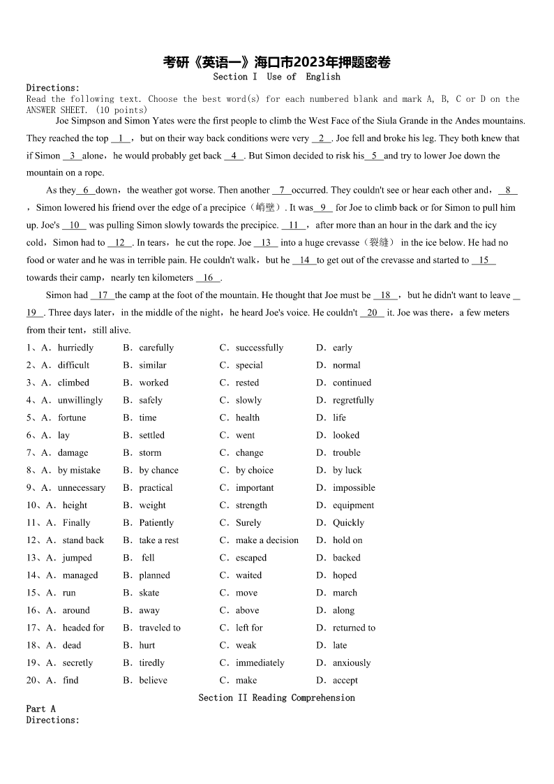 考研《英语一》海口市2023年押题密卷SectionIUseofEnglishDirections:Readthefollowingtext.Choosethebestword(s)foreachnumberedblankandmarkA,B,CorDontheANSWERSHEET.(10points)JoeSimpsonandSimonYateswerethefirstpeopletoclimbtheWestFaceoftheSiulaGrandeintheAndesmountains.Theyrea
