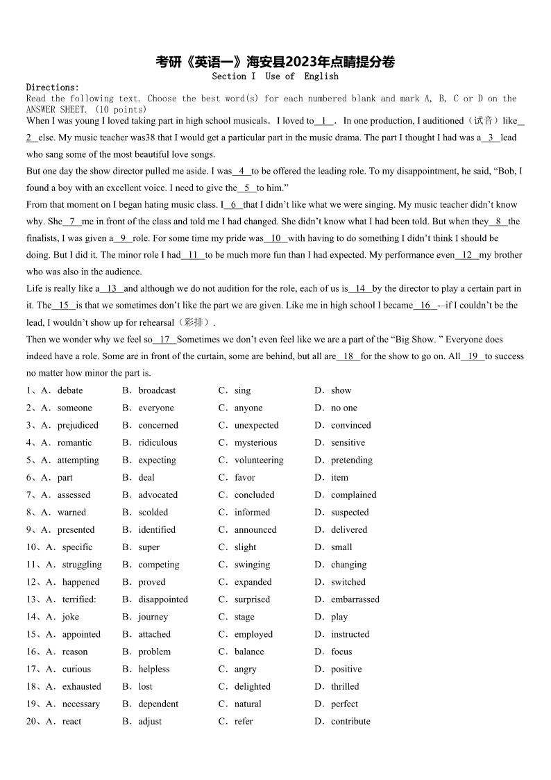 考研《英语一》海安县2023年点睛提分卷SectionIUseofEnglishDirections:Readthefollowingtext.Choosethebestword(s)foreachnumberedblankandmarkA,B,CorDontheANSWERSHEET.(10points)WhenIwasyoungIlovedtakingpartinhighschoolmusicals.Ilovedto1.Inoneproduction,Iauditioned(试音)like2else.