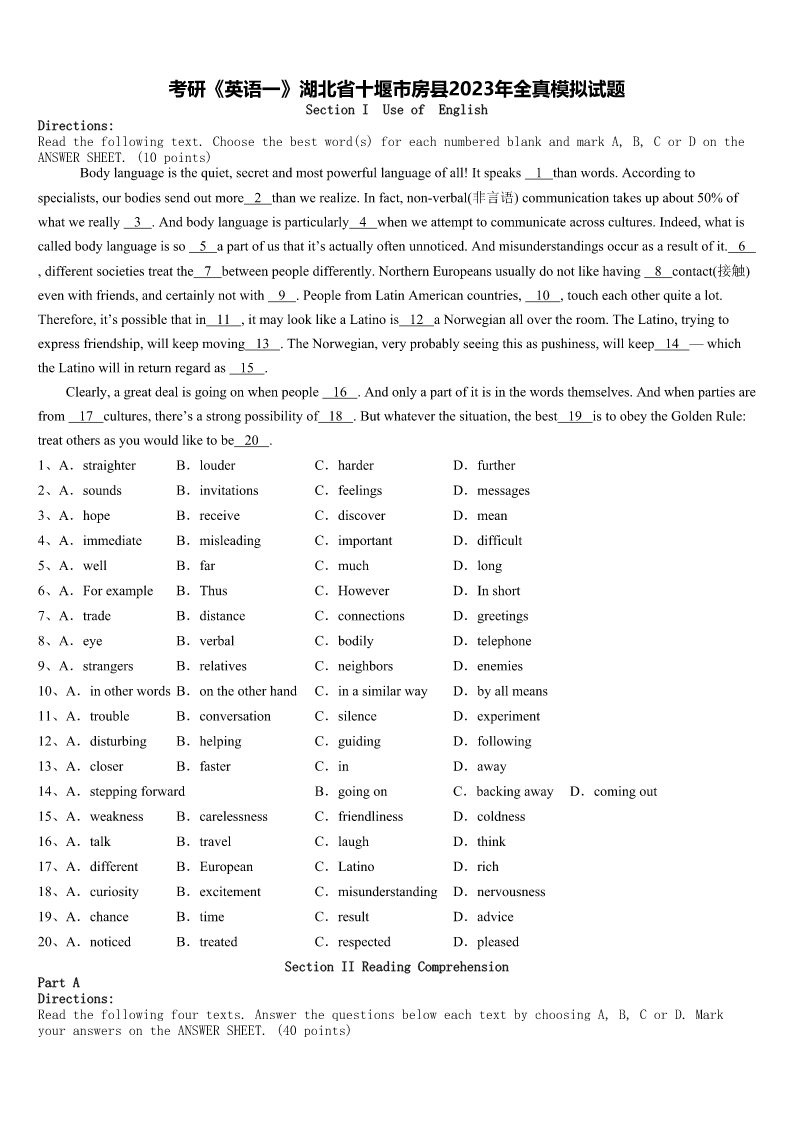 考研《英语一》湖北省十堰市房县2023年全真模拟试题SectionIUseofEnglishDirections:Readthefollowingtext.Choosethebestword(s)foreachnumberedblankandmarkA,B,CorDontheANSWERSHEET.(10points)Bodylanguageisthequiet,secretandmostpowerfullanguageofall!Itspeaks1thanwords.Accordingtospecial