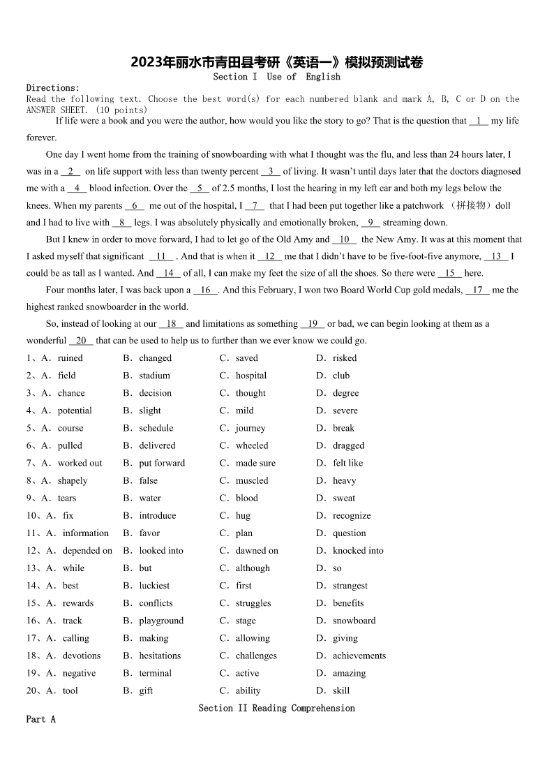 2023年丽水市青田县考研《英语一》模拟预测试卷SectionIUseofEnglishDirections:Readthefollowingtext.Choosethebestword(s)foreachnumberedblankandmarkA,B,CorDontheANSWERSHEET.(10points)Iflifewereabookandyouweretheauthor,howwouldyoulikethestorytogo?Thatisthequestionthat1mylifeforeve