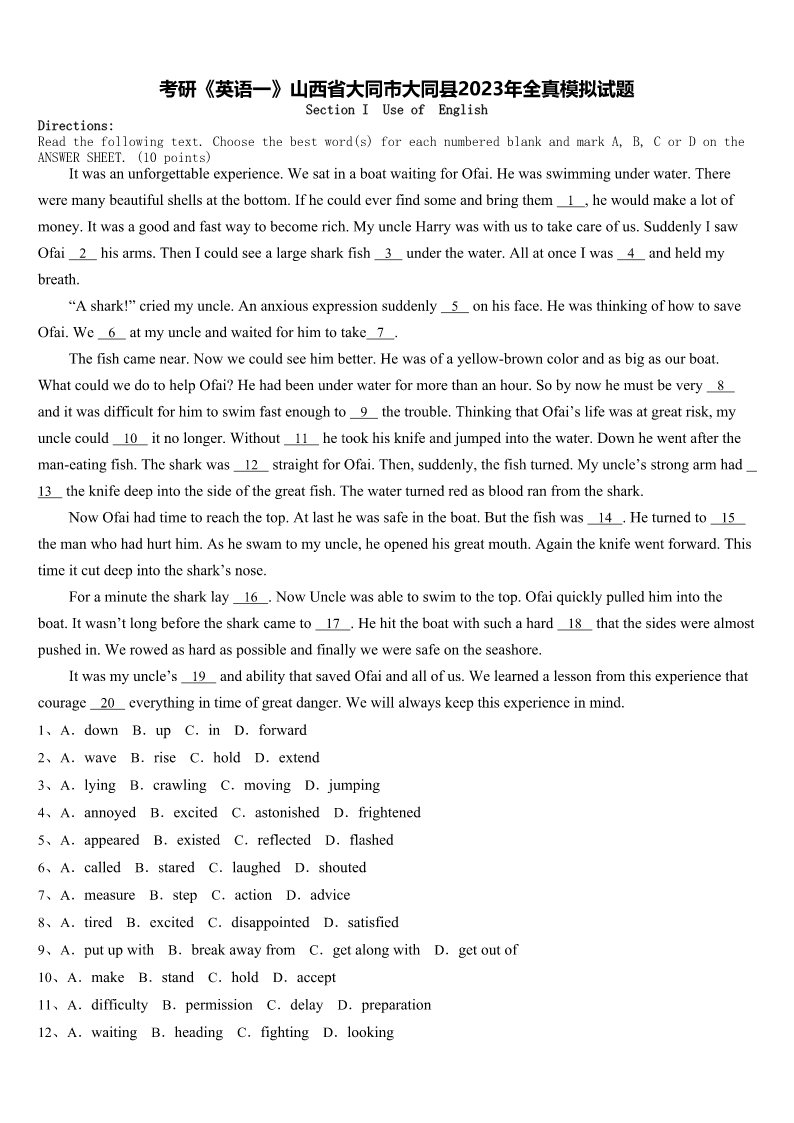 考研《英语一》山西省大同市大同县2023年全真模拟试题SectionIUseofEnglishDirections:Readthefollowingtext.Choosethebestword(s)foreachnumberedblankandmarkA,B,CorDontheANSWERSHEET.(10points)Itwasanunforgettableexperience.WesatinaboatwaitingforOfai.Hewasswimmingunderwater.Therewereman