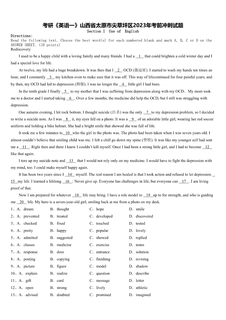 考研《英语一》山西省太原市尖草坪区2023年考前冲刺试题SectionIUseofEnglishDirections:Readthefollowingtext.Choosethebestword(s)foreachnumberedblankandmarkA,B,CorDontheANSWERSHEET.(10points)RediscoveryIusedtobeahappychildwithalovingfamilyandmanyfriends.Ihada1thatcouldbrightenacoldwi