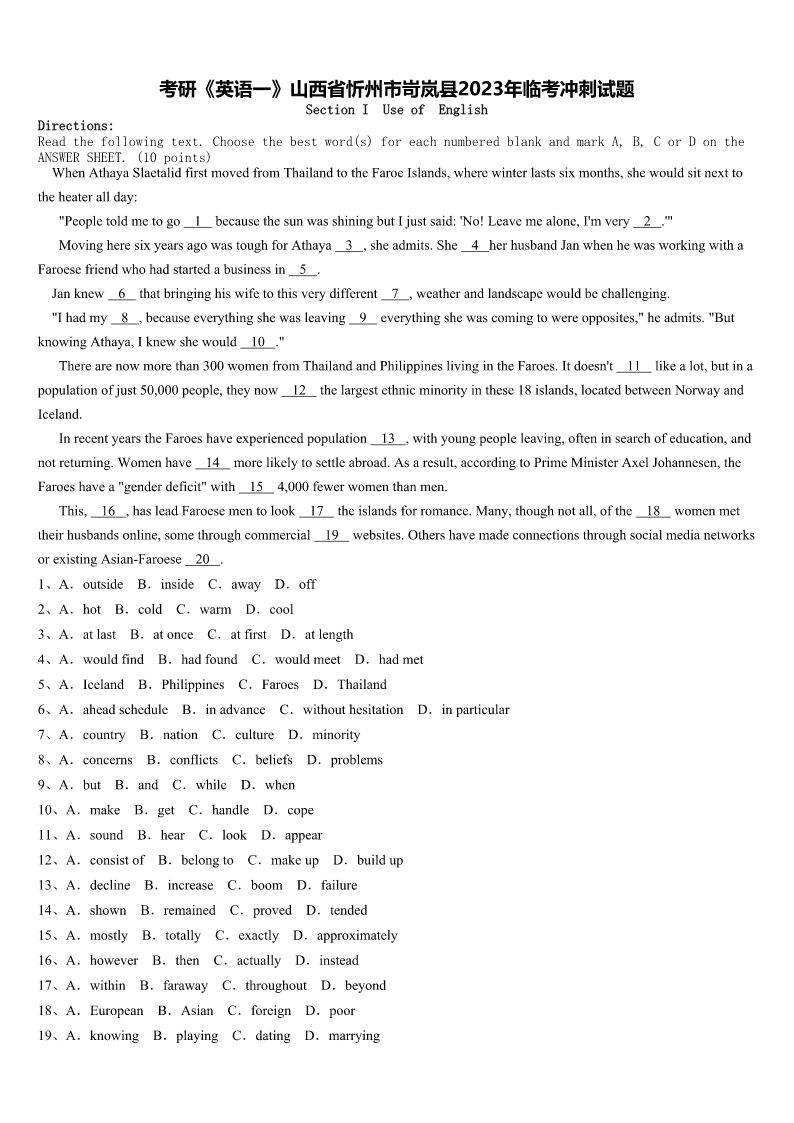 考研《英语一》山西省忻州市岢岚县2023年临考冲刺试题SectionIUseofEnglishDirections:Readthefollowingtext.Choosethebestword(s)foreachnumberedblankandmarkA,B,CorDontheANSWERSHEET.(10points)WhenAthayaSlaetalidfirstmovedfromThailandtotheFaroeIslands,wherewinterlastssixmonths,shewoulds