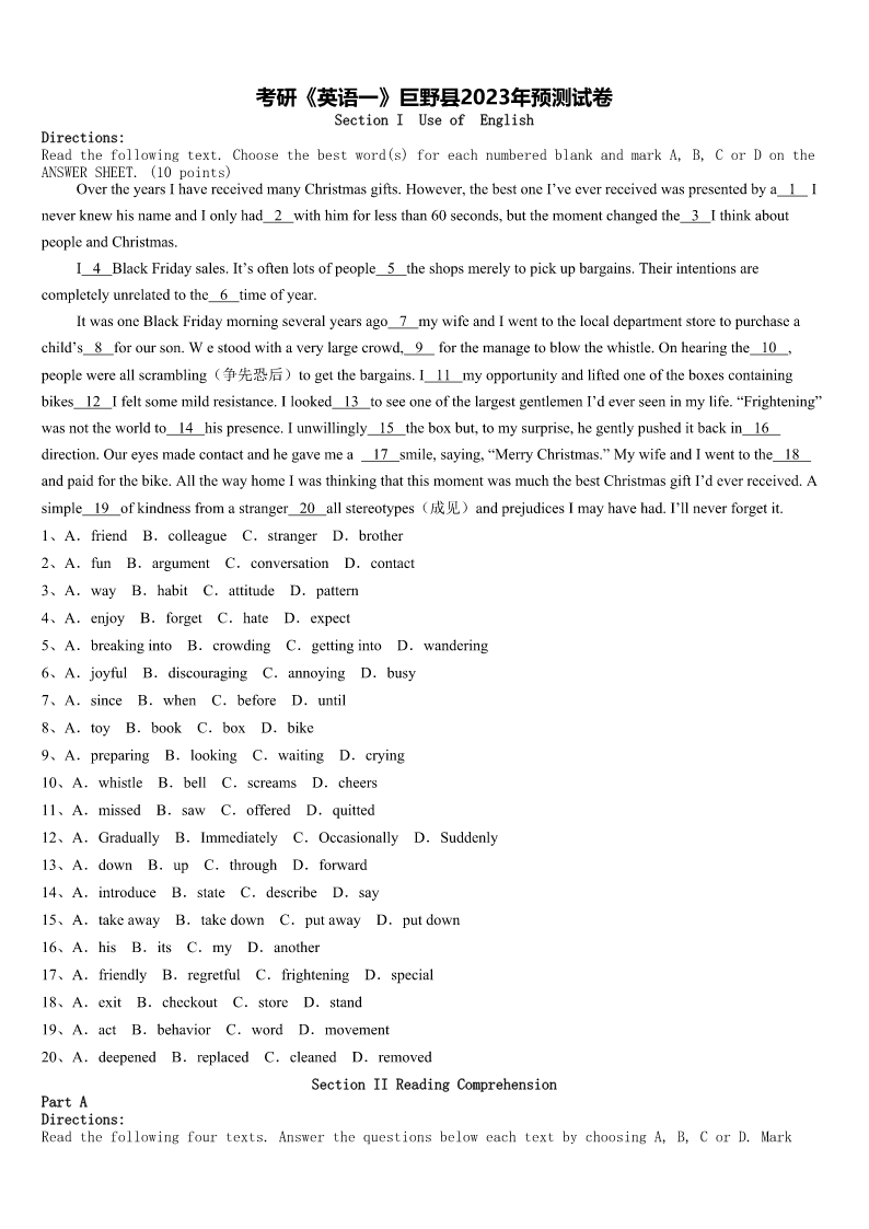 考研《英语一》巨野县2023年预测试卷SectionIUseofEnglishDirections:Readthefollowingtext.Choosethebestword(s)foreachnumberedblankandmarkA,B,CorDontheANSWERSHEET.(10points)OvertheyearsIhavereceivedmanyChristmasgifts.However,thebestoneI’veeverreceivedwaspresentedbya1Ineverkn