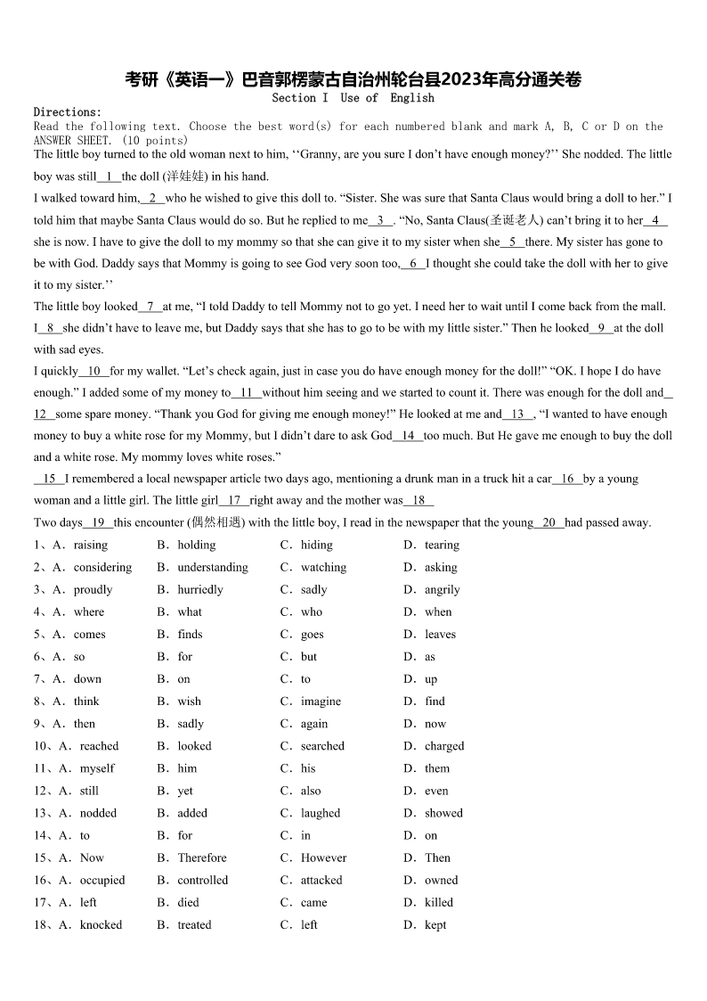 考研《英语一》巴音郭楞蒙古自治州轮台县2023年高分通关卷SectionIUseofEnglishDirections:Readthefollowingtext.Choosethebestword(s)foreachnumberedblankandmarkA,B,CorDontheANSWERSHEET.(10points)Thelittleboyturnedtotheoldwomannexttohim,‘‘Granny,areyousureIdon’thaveenoughmoney?’’Shenodde