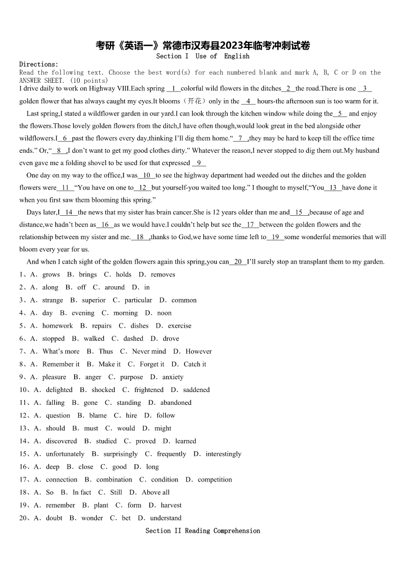 考研《英语一》常德市汉寿县2023年临考冲刺试卷SectionIUseofEnglishDirections:Readthefollowingtext.Choosethebestword(s)foreachnumberedblankandmarkA,B,CorDontheANSWERSHEET.(10points)IdrivedailytoworkonHighwayⅧ.Eachspring1colorfulwildflowersintheditches2theroad.Thereisone3goldenf