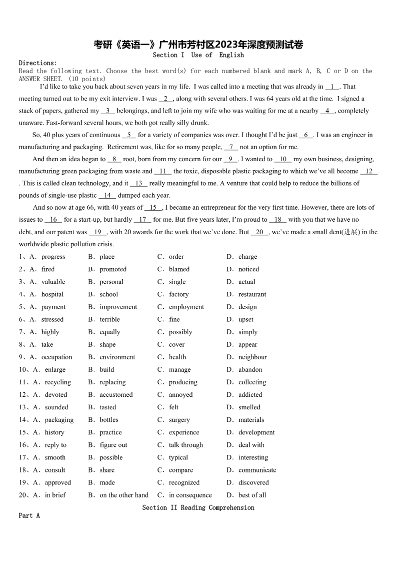 考研《英语一》广州市芳村区2023年深度预测试卷SectionIUseofEnglishDirections:Readthefollowingtext.Choosethebestword(s)foreachnumberedblankandmarkA,B,CorDontheANSWERSHEET.(10points)I’dliketotakeyoubackaboutsevenyearsinmylife.Iwascalledintoameetingthatwasalreadyin1.Thatmeetingtu