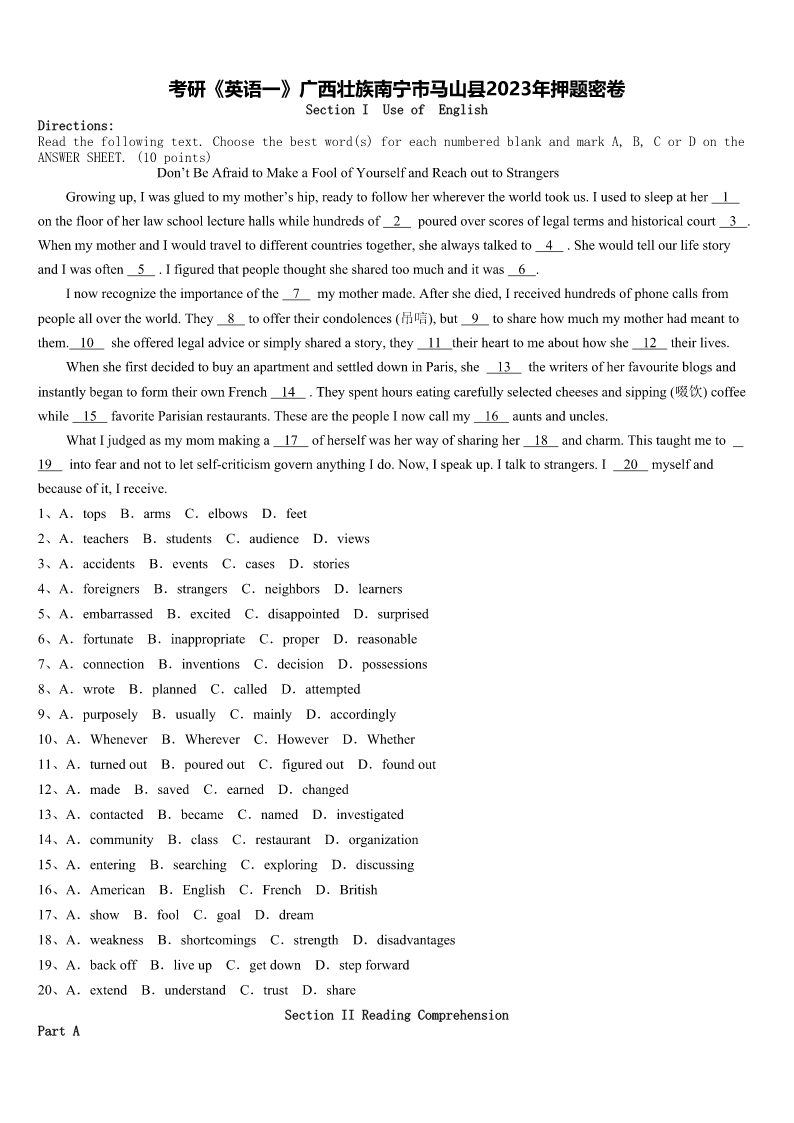 考研《英语一》广西壮族南宁市马山县2023年押题密卷SectionIUseofEnglishDirections:Readthefollowingtext.Choosethebestword(s)foreachnumberedblankandmarkA,B,CorDontheANSWERSHEET.(10points)Don’tBeAfraidtoMakeaFoolofYourselfandReachouttoStrangersGrowingup,Iwasgluedtomymother’ship,read