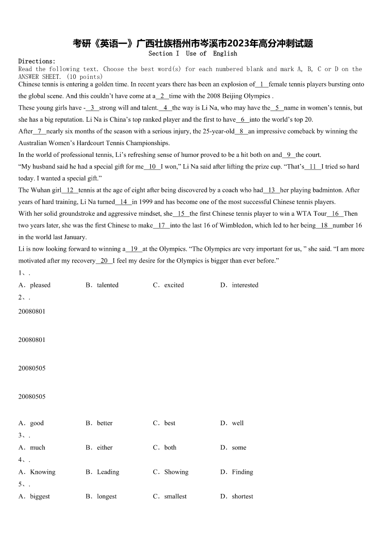考研《英语一》广西壮族梧州市岑溪市2023年高分冲刺试题SectionIUseofEnglishDirections:Readthefollowingtext.Choosethebestword(s)foreachnumberedblankandmarkA,B,CorDontheANSWERSHEET.(10points)Chinesetennisisenteringagoldentime.Inrecentyearstherehasbeenanexplosionof1femaletennisplayers