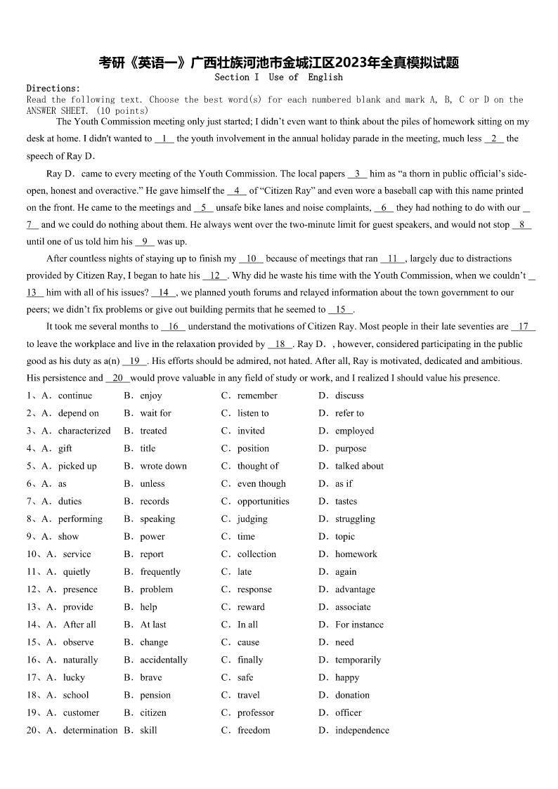 考研《英语一》广西壮族河池市金城江区2023年全真模拟试题SectionIUseofEnglishDirections:Readthefollowingtext.Choosethebestword(s)foreachnumberedblankandmarkA,B,CorDontheANSWERSHEET.(10points)TheYouthCommissionmeetingonlyjuststarted;Ididn’tevenwanttothinkaboutthepilesofhomeworksittin