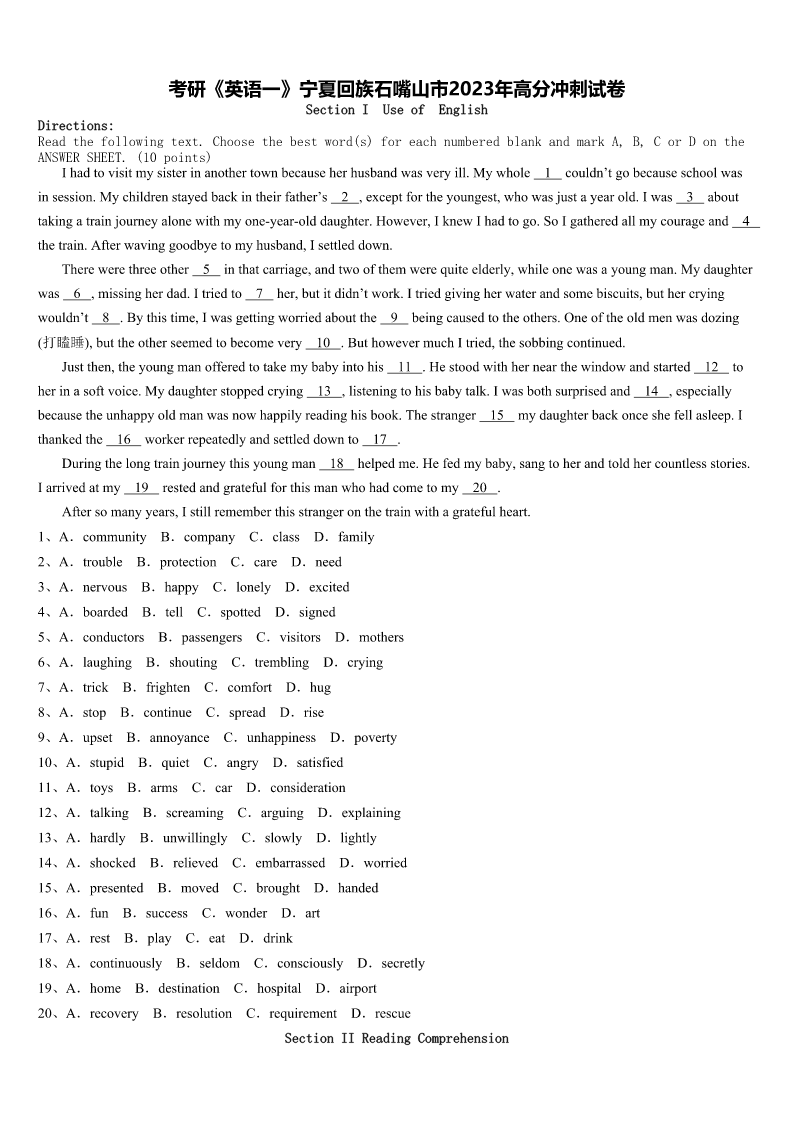 考研《英语一》宁夏回族石嘴山市2023年高分冲刺试卷SectionIUseofEnglishDirections:Readthefollowingtext.Choosethebestword(s)foreachnumberedblankandmarkA,B,CorDontheANSWERSHEET.(10points)Ihadtovisitmysisterinanothertownbecauseherhusbandwasveryill.Mywhole1couldn’tgobecauseschoolwasi