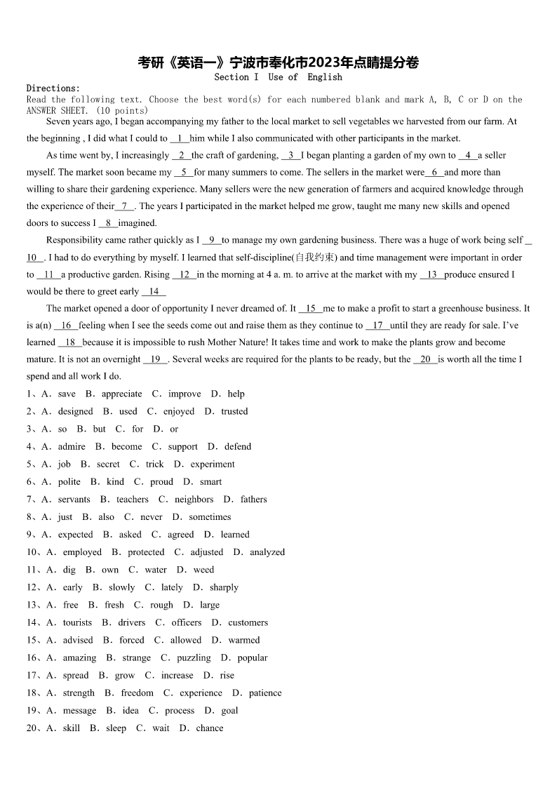 考研《英语一》宁波市奉化市2023年点睛提分卷SectionIUseofEnglishDirections:Readthefollowingtext.Choosethebestword(s)foreachnumberedblankandmarkA,B,CorDontheANSWERSHEET.(10points)Sevenyearsago,Ibeganaccompanyingmyfathertothelocalmarkettosellvegetablesweharvestedfromourfarm.Att