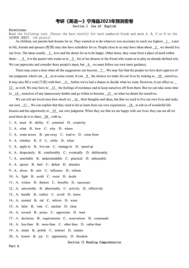 考研《英语一》宁海县2023年预测密卷SectionIUseofEnglishDirections:Readthefollowingtext.Choosethebestword(s)foreachnumberedblankandmarkA,B,CorDontheANSWERSHEET.(10points)Aschildren,ourparentshaddreamsforus.Theywantedustodowhateverwasnecessarytoreachourhighest1.Laterinlife