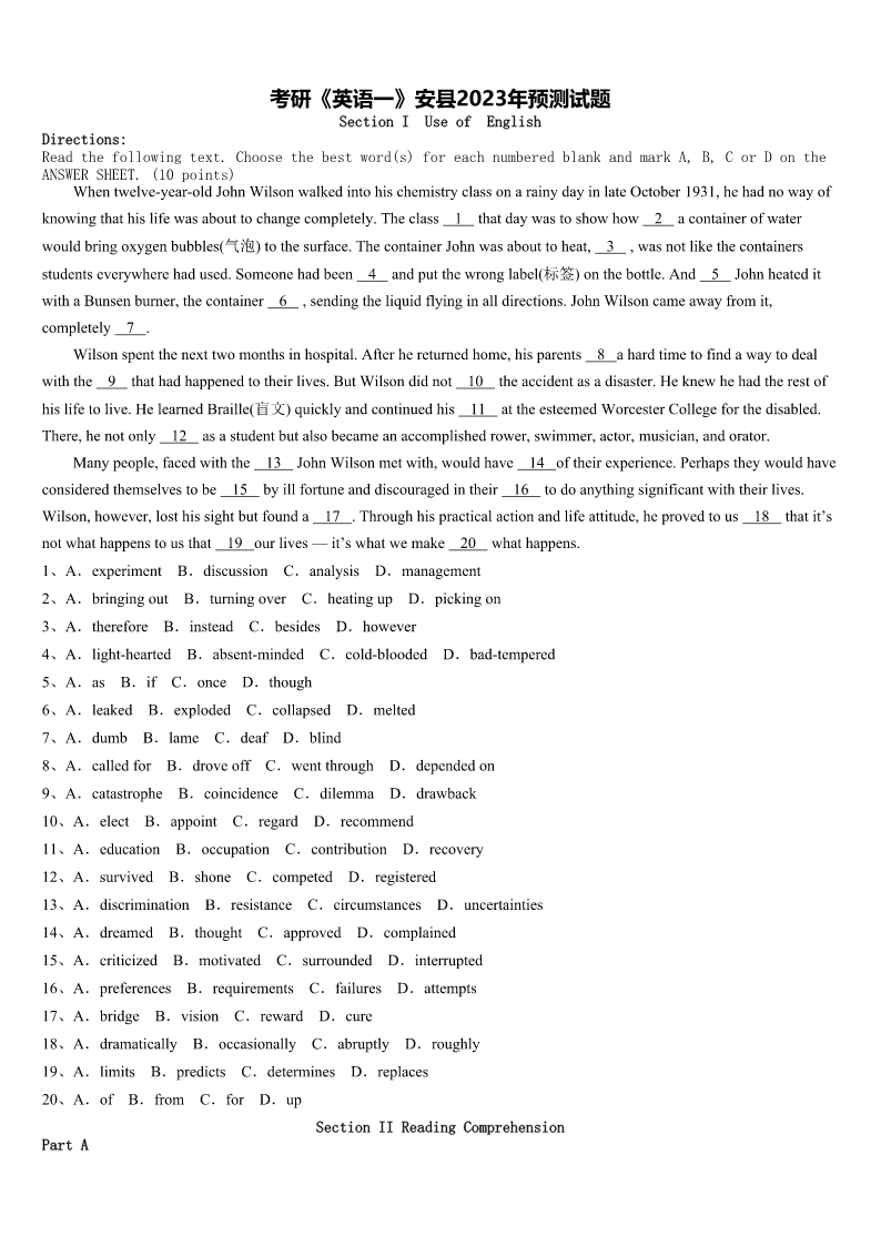 考研《英语一》安县2023年预测试题SectionIUseofEnglishDirections:Readthefollowingtext.Choosethebestword(s)foreachnumberedblankandmarkA,B,CorDontheANSWERSHEET.(10points)Whentwelve-year-oldJohnWilsonwalkedintohischemistryclassonarainydayinlateOctober1931,hehadnowayofknowin