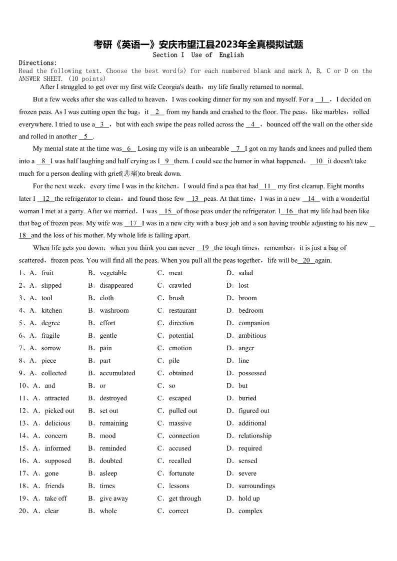 考研《英语一》安庆市望江县2023年全真模拟试题SectionIUseofEnglishDirections:Readthefollowingtext.Choosethebestword(s)foreachnumberedblankandmarkA,B,CorDontheANSWERSHEET.(10points)AfterIstruggledtogetovermyfirstwifeCeorgia'sdeath,mylifefinallyreturnedtonormal.Butafewweeksafter