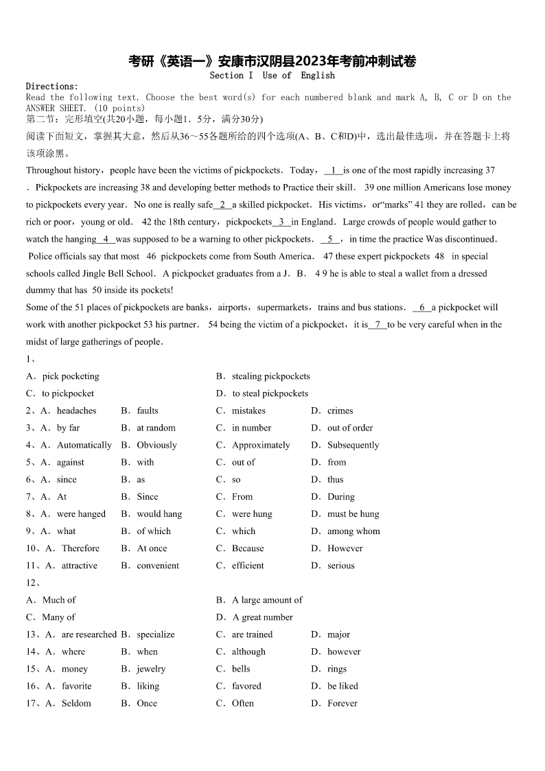 考研《英语一》安康市汉阴县2023年考前冲刺试卷SectionIUseofEnglishDirections:Readthefollowingtext.Choosethebestword(s)foreachnumberedblankandmarkA,B,CorDontheANSWERSHEET.(10points)第二节:完形填空(共20小题,每小题1.5分,满分30分)阅读下面短文,掌握其大意,然后从36~55各题所给的四个选项(A、B、C和D)中,选出最佳选项,并在答题卡上将该项涂黑。Througho