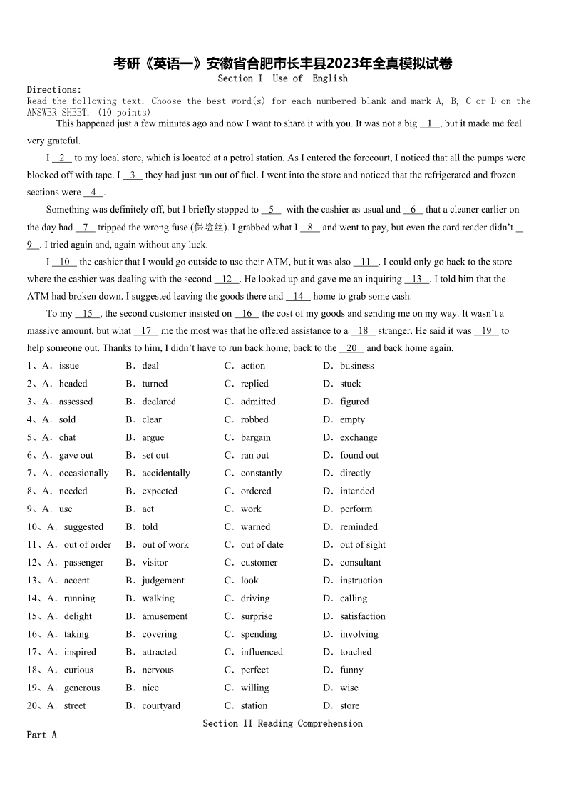考研《英语一》安徽省合肥市长丰县2023年全真模拟试卷SectionIUseofEnglishDirections:Readthefollowingtext.Choosethebestword(s)foreachnumberedblankandmarkA,B,CorDontheANSWERSHEET.(10points)ThishappenedjustafewminutesagoandnowIwanttoshareitwithyou.Itwasnotabig1,butitmademefeelverygra