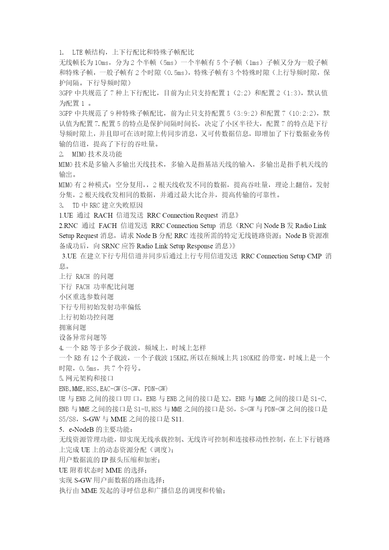 LTE帧结构,上下行配比和特殊子帧配比无线帧长为10ms,分为2个半帧(5ms)一个半帧有5个子帧(1ms)子帧又分为一般子帧和特殊子帧,一般子帧有2个时隙(0.5ms),特殊子帧有3个特殊时隙(上行导频时隙,保护间隔。下行导频时隙)3GPP中共规范了7种上下行配比,目前为止只支持配置1(2:2)和配置2(1:3),默认值为配置1。3GPP中共规范了9种特殊子帧配比,前为止只支持配置5(3:9:2)和配置7(10:2:2),默认值为配置7.配置5的特点是保护间隔时间长,决定了小区半径大,配置7的特点是下行