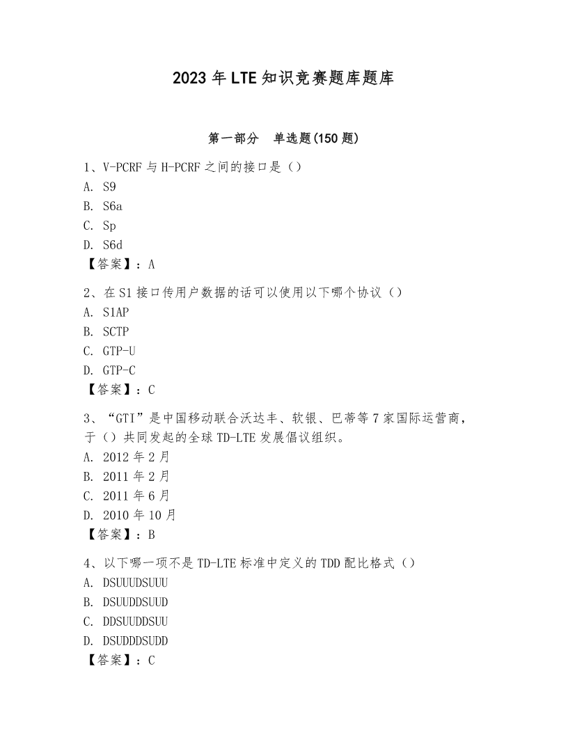2023年LTE知识竞赛题库题库第一部分单选题(150题)1、V-PCRF与H-PCRF之间的接口是()A.S9B.S6aC.SpD.S6d【答案】:A2、在S1接口传用户数据的话可以使用以下哪个协议()A.S1APB.SCTPC.GTP-UD.GTP-C【答案】:C3、“GTI”是中国移动联合沃达丰、软银、巴蒂等7家国际运营商,于()共同发起的全球TD-LTE发展倡议组织。A.2012年2月B.2011年2月C.2011年6月D.2010年10月【答案】:B4、以下哪一项不是TD-LTE标准中定义的TD