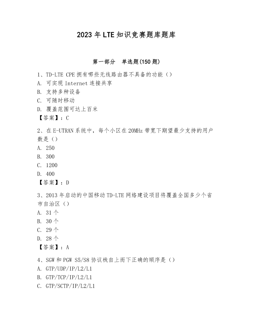 2023年LTE知识竞赛题库题库第一部分单选题(150题)1、TD-LTECPE拥有哪些无线路由器不具备的功能()A.可实现Internet连接共享B.支持多种设备C.可随时移动D.覆盖范围可达上百米【答案】:C2、在E-UTRAN系统中,每个小区在20MHz带宽下期望最少支持的用户数是()A.250B.300C.1200D.400【答案】:D3、2013年启动的中国移动TD-LTE网络建设项目将覆盖全国多少个省市自治区()A.31个B.30个C.29个D.28个【答案】:A4、SGW和PGWS5/S8协