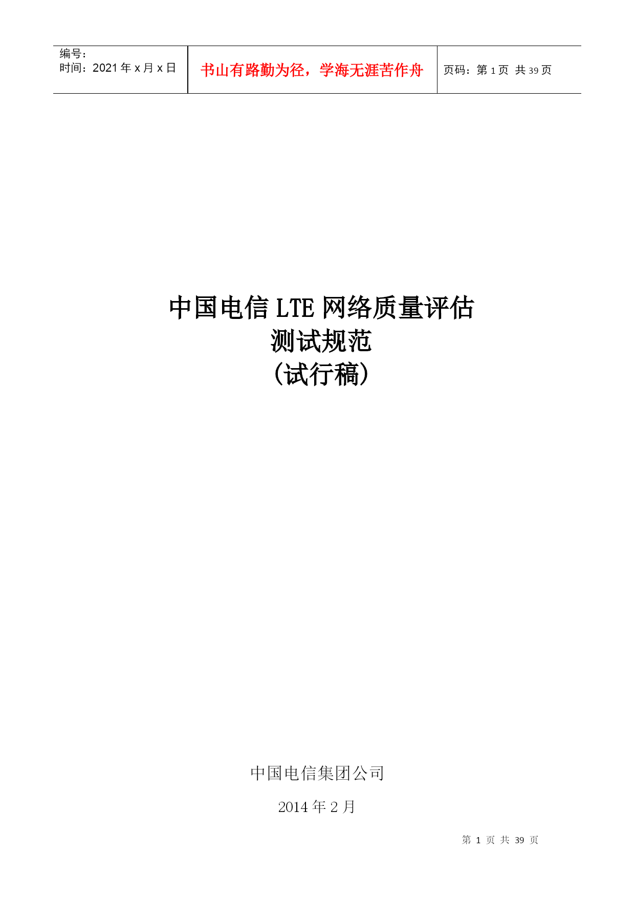 编号:时间:2021年x月x日书山有路勤为径,学海无涯苦作舟页码:第页共NUMPAGES39页第PAGE\*MERGEFORMAT39页共NUMPAGES\*MERGEFORMAT39页中国电信LTE网络质量评估测试规范(试行稿)中国电信集团公司2014年2月目录TOC\o"1-4"\h\z\uHYPERLINK\l"_Toc372540610"1.总则PAGEREF_Toc372540610\h5HYPERLINK\l"_Toc372540611"1.1概述PAG