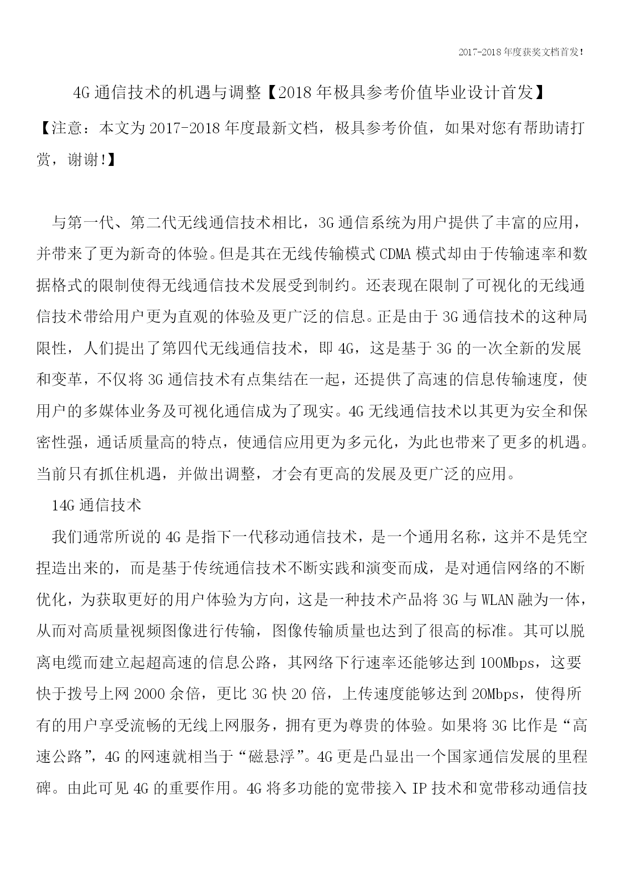 2017-2018年度获奖文档首发!4G通信技术的机遇与调整【2018年极具参考价值毕业设计首发】【注意:本文为2017-2018年度最新文档,极具参考价值,如果对您有帮助请打赏,谢谢!】与第一代、第二代无线通信技术相比,3G通信系统为用户提供了丰富的应用,并带来了更为新奇的体验。但是其在无线传输模式CDMA模式却由于传输速率和数据格式的限制使得无线通信技术发展受到制约。还表现在限制了可视化的无线通信技术带给用户更为直观的体验及更广泛的信息。正是由于3G通信技术的这种局限性,人们提出了第四代无线通信技术,