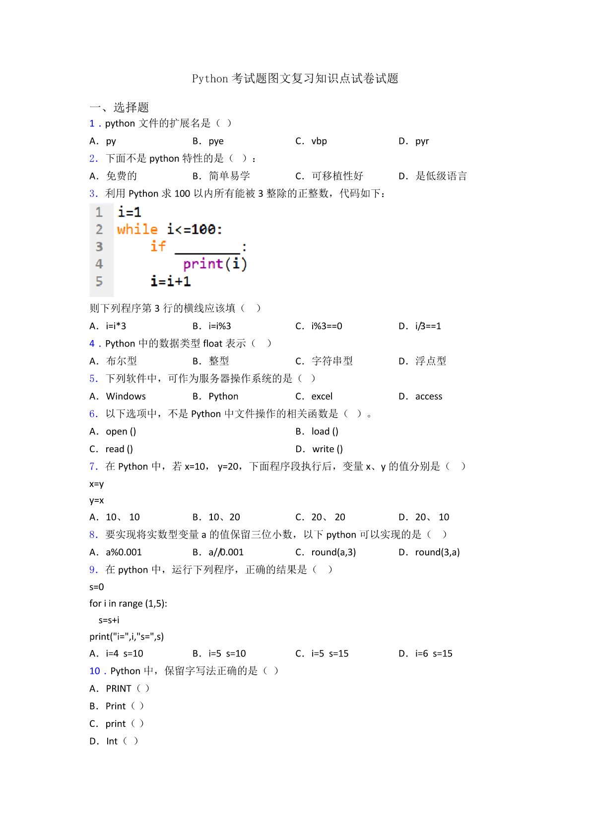 Python考试题图文复习知识点试卷试题一、选择题1.python文件的扩展名是()A.pyB.pyeC.vbpD.pyr2.下面不是python特性的是():A.免费的B.简单易学C.可移植性好D.是低级语言3.利用Python求100以内所有能被3整除的正整数,代码如下:则下列程序第3行的横线应该填()A.i=i*3B.i=i%3C.i%3==0D.i/3==14.Python中的数据类型float表示()A.布尔型B.整型C.字符串型D.浮点型5.下列软件中,可作为服务器操作系统的是()A.Wind