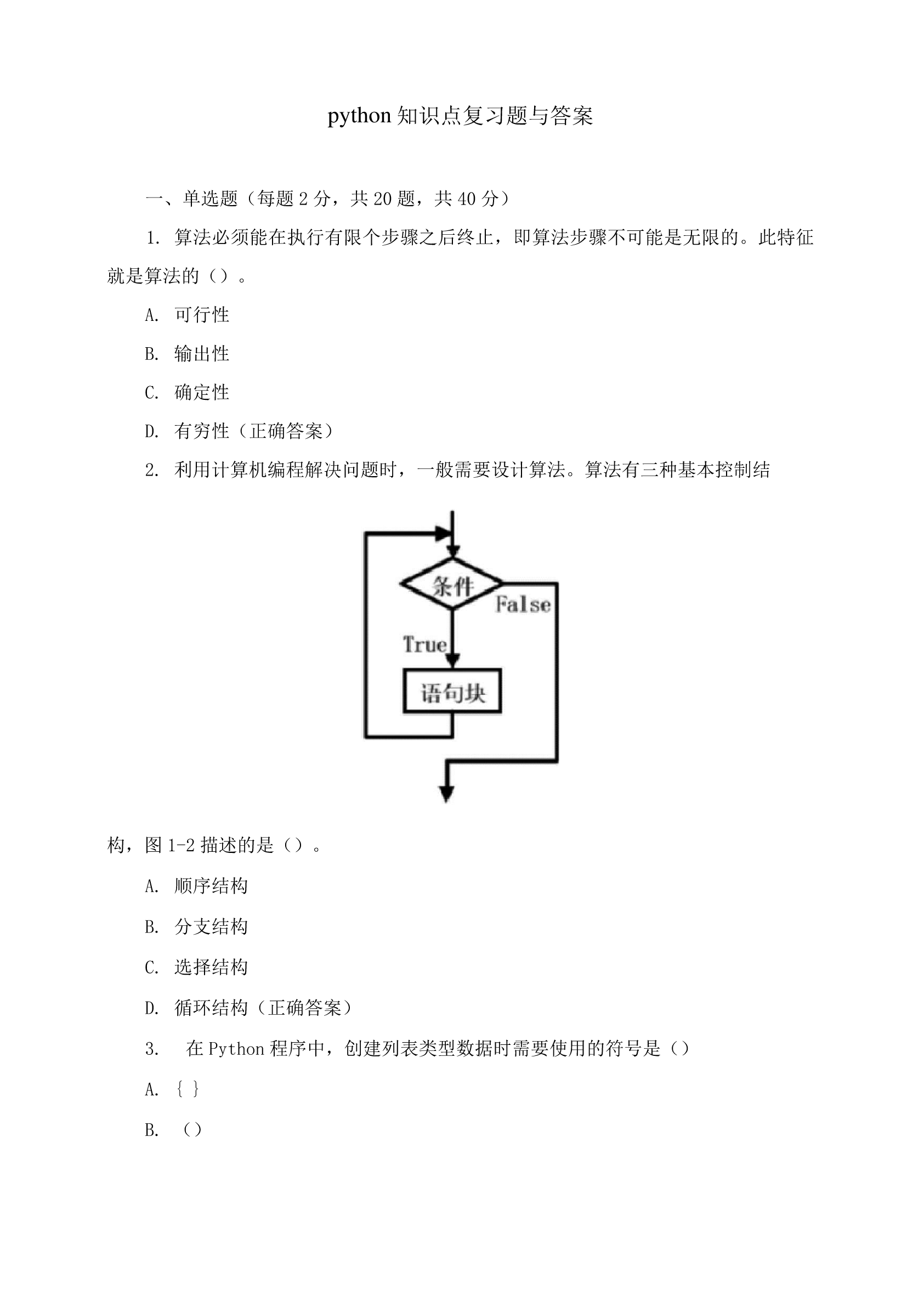 python知识点复习题与答案一、单选题(每题2分,共20题,共40分)1.算法必须能在执行有限个步骤之后终止,即算法步骤不可能是无限的。此特征就是算法的()。A.可行性B.输出性C.确定性D.有穷性(正确答案)2.利用计算机编程解决问题时,一般需要设计算法。算法有三种基本控制结构,图1-2描述的是()。A.顺序结构B.分支结构C.选择结构D.循环结构(正确答案)3.在Python程序中,创建列表类型数据时需要使用的符号是()A.{}B.()C.[](正确答案)D.«»4.在Python程序中,关系表达式