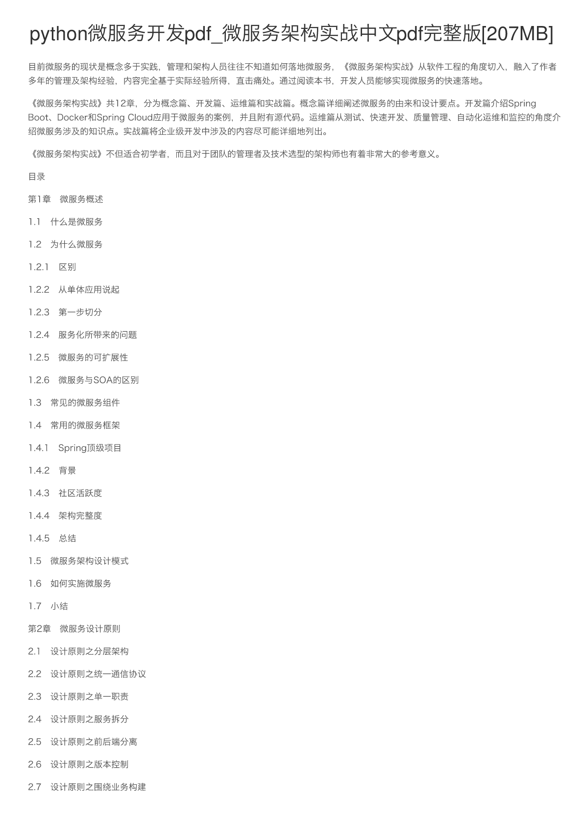 python微服务开发pdf_微服务架构实战中⽂pdf完整版[207MB]⽬前微服务的现状是概念多于实践,管理和架构⼈员往往不知道如何落地微服务,《微服务架构实战》从软件⼯程的⾓度切⼊,融⼊了作者多年的管理及架构经验,内容完全基于实际经验所得,直击痛处。通过阅读本书,开发⼈员能够实现微服务的快速落地。《微服务架构实战》共12章,分为概念篇、开发篇、运维篇和实战篇。概念篇详细阐述微服务的由来和设计要点。开发篇介绍SpringBoot、Docker和SpringCloud应⽤于微服务的案例,并且附有源代码。运