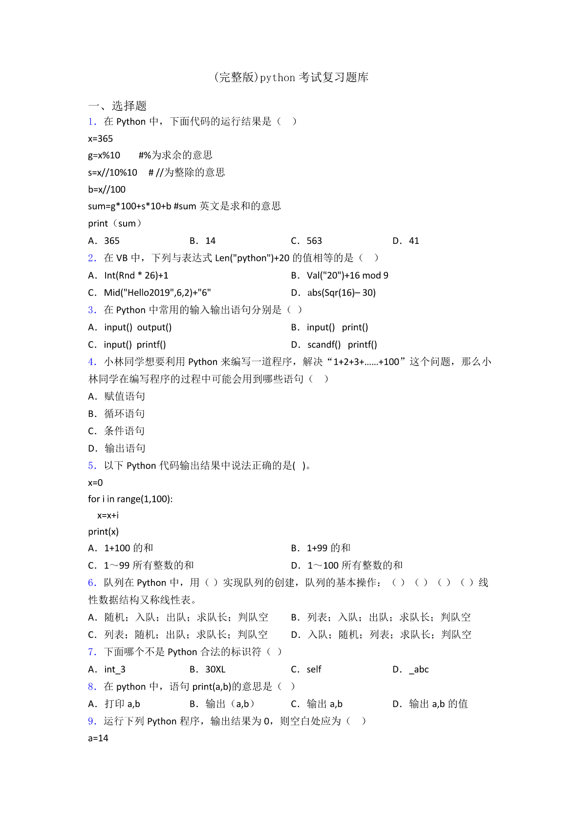 (完整版)python考试复习题库一、选择题1.在Python中,下面代码的运行结果是()x=365g=x%10#%为求余的意思s=x//10%10#//为整除的意思b=x//100sum=g*100+s*10+b#sum英文是求和的意思print(sum)A.365B.14C.563D.412.在VB中,下列与表达式Len("python")+20的值相等的是()A.Int(Rnd*26)+1B.Val("20")+16mod9C.Mid("Hello2019",6,2)+"6"D.abs(Sqr(16