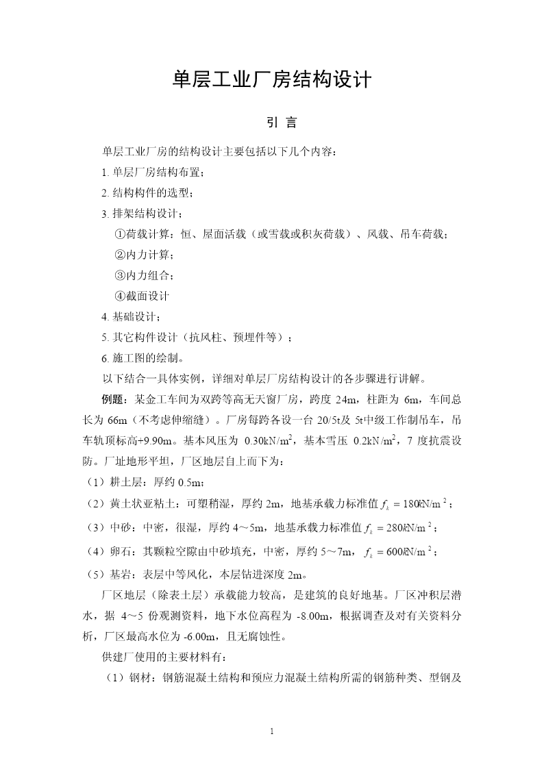 单层工业厂房结构设计引言单层工业厂房的结构设计主要包括以下几个内容:1.单层厂房结构布置;2.结构构件的选型;3.排架结构设计;①荷载计算:恒、屋面活载(或雪载或积灰荷载)、风载、吊车荷载;②内力计算;③内力组合;④截面设计4.基础设计;5.其它构件设计(抗风柱、预埋件等);6.施工图的绘制。以下结合一具体实例,详细对单层厂房结构设计的各步骤进行讲解。例题:某金工车间为双跨等高无天窗厂房,跨度24m,柱距为6m,车间总长为66m(不考虑伸缩缝)。厂房每跨各设一台20/5t及5t中级工作制吊车,吊车轨顶标高