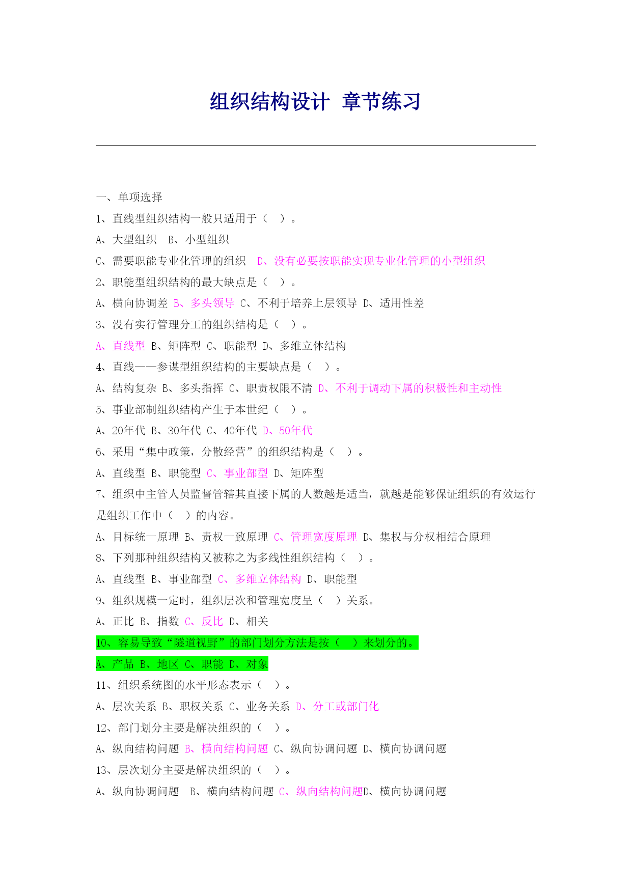 组织结构设计章节练习一、单项选择1、直线型组织结构一般只适用于()。A、大型组织B、小型组织C、需要职能专业化管理的组织D、没有必要按职能实现专业化管理的小型组织2、职能型组织结构的最大缺点是()。A、横向协调差B、多头领导C、不利于培养上层领导D、适用性差3、没有实行管理分工的组织结构是()。A、直线型B、矩阵型C、职能型D、多维立体结构4、直线——参谋型组织结构的主要缺点是()。A、结构复杂B、多头指挥C、职责权限不清D、不利于调动下属的积极性和主动性5、事业部制组织结构产生于本世纪()。A、20年代