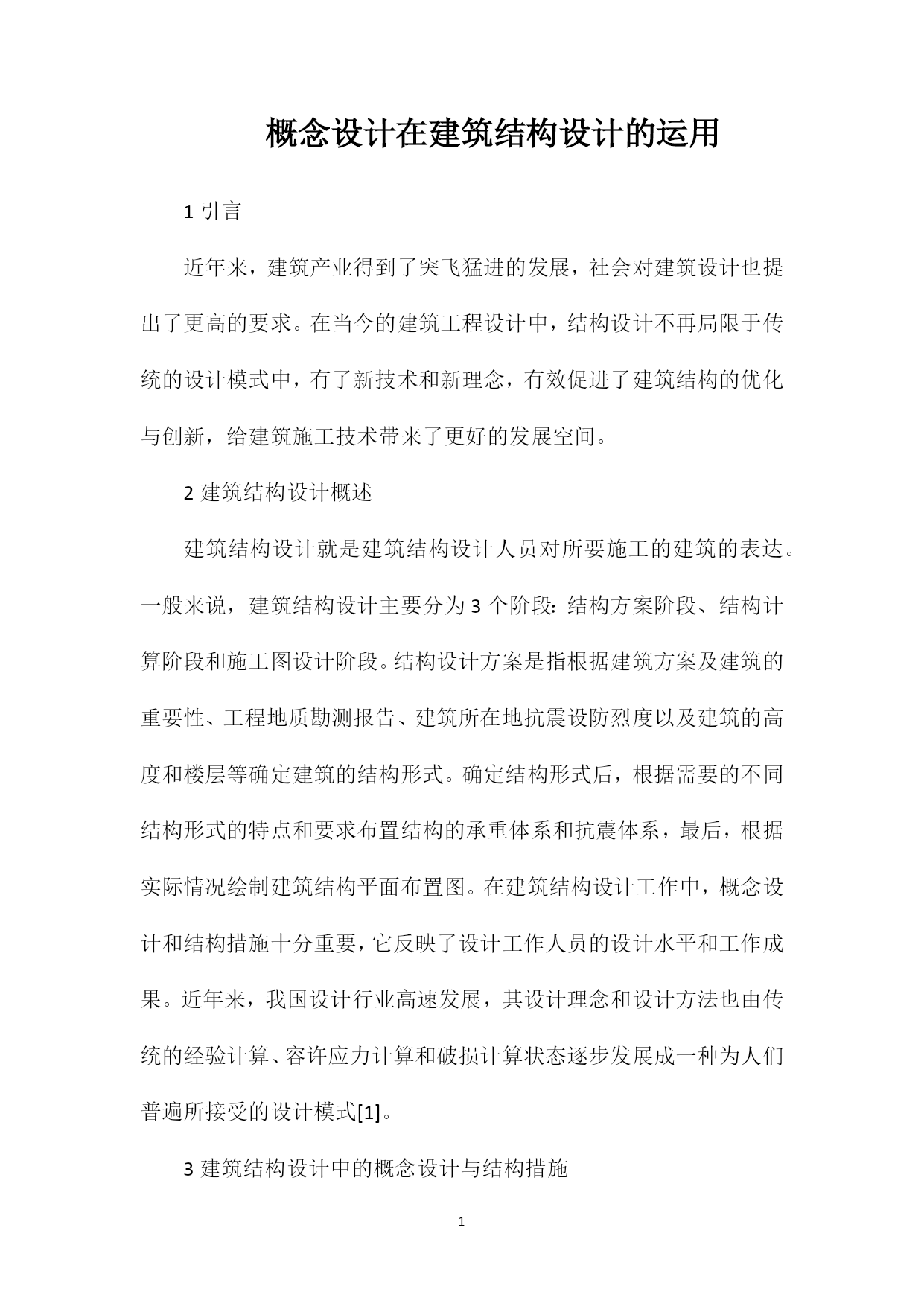 概念设计在建筑结构设计的运用1引言近年来,建筑产业得到了突飞猛进的发展,社会对建筑设计也提出了更高的要求。在当今的建筑工程设计中,结构设计不再局限于传统的设计模式中,有了新技术和新理念,有效促进了建筑结构的优化与创新,给建筑施工技术带来了更好的发展空间。2建筑结构设计概述建筑结构设计就是建筑结构设计人员对所要施工的建筑的表达。一般来说,建筑结构设计主要分为3个阶段:结构方案阶段、结构计算阶段和施工图设计阶段。结构设计方案是指根据建筑方案及建筑的重要性、工程地质勘测报告、建筑所在地抗震设防烈度以及建筑的高度